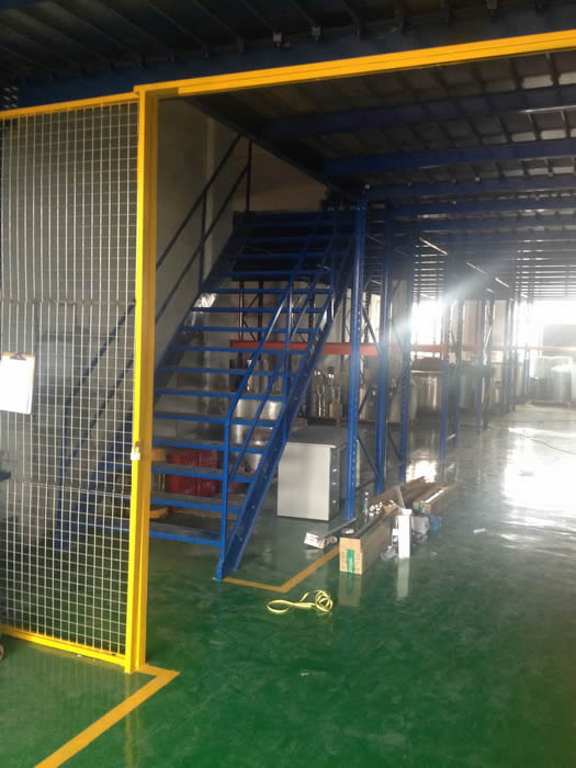 一樓可能通過堆高機作業,一般擺放可以上貨架的物品及存取頻率比較高的貨物,這樣在閣樓平臺中,將主要作業集中在一樓,而二樓的貨物,可以通過我們設置的樓梯通過人工存取,當然,有時我們也會根據客戶要求,設計上下貨口或升降平臺存取。