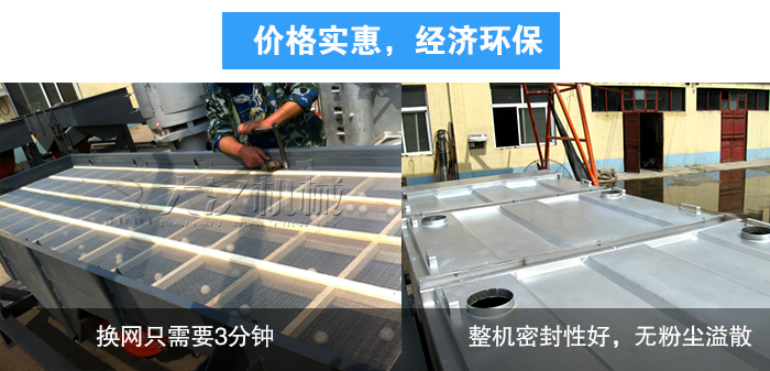 直線振動篩結構非常簡單,操作也非常方便,換網只需要3分鐘,同時整機密封性好,無粉塵溢散,不污染環境。其產品造價低,耗能低,使用起來也非常經濟,是性價比非常高的設備。