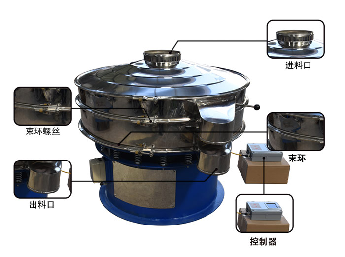 旋振篩主要由進料口、防塵蓋、出料口、束環、篩網、配重塊、上部重錘、振動體、振動電機、彈簧、下部重錘、機座等部分組成。