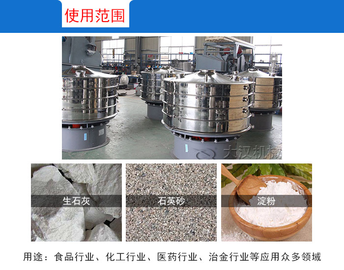 旋振篩廣泛應用于食品、化工、醫藥、冶金等行業,任何顆粒、粉末、粘液一定范圍內均可篩選, 如:米粉、奶粉、豆漿、油漆、純堿、檸檬粉、橡膠、塑料、中藥粉、電磁材料、金屬粉末、焊條粉末、石英砂等。
