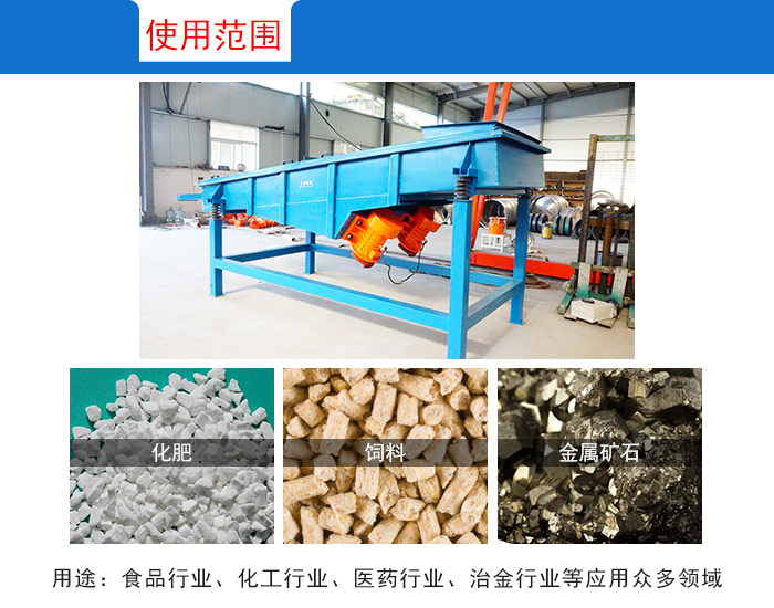 直線篩適用于化工、食品、塑料、醫藥、冶金、玻璃、建材、糧食、化肥、磨料、陶瓷等行業中干式粉狀物料的篩分,如:化肥、尿素、淀粉、食鹽、米粉、奶粉、橡膠、電解銅粉、電磁性材料等。