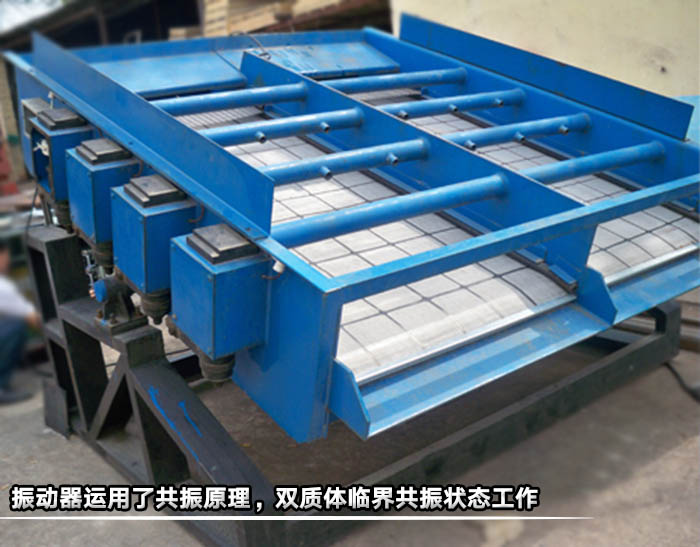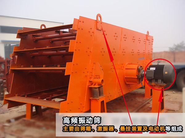 高頻振動篩結(jié)構(gòu):主要由篩箱、激振器、懸掛(或支承)裝置及電動機(jī)等組成。電動機(jī)經(jīng)三角皮帶,帶動激振器主軸回轉(zhuǎn),由于激振器上不平衡重物的離心慣性力作用,使篩箱獲振動。改變激振器偏心重,可獲得不同振幅。