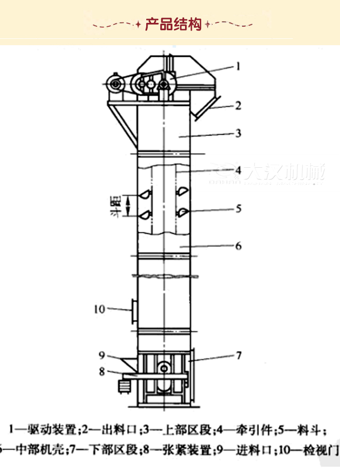 斗式提升機由運行部件、驅動裝置、上部裝置、中部機殼、下部裝置組成。