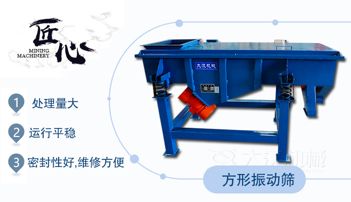 方形直線振動篩利用振動電機激振作為振動源,使物料在篩網上被拋起,同時向前作直線運動,物料從給料機均勻地進入篩分機的進料口,通過多層篩網產生數種規格的篩上物、篩下物、分別從各自的出口排出。具有耗能低、產量高、結構簡單、易維修、全封閉結構,無粉塵溢散,自動排料,更適合于流水線作業。