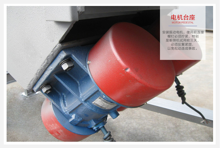 5、電機臺座:安裝振動電機,使用前連接螺釘必須擰緊,特別是新篩機試用前三天、必須反復緊固,以免松動造成事故。