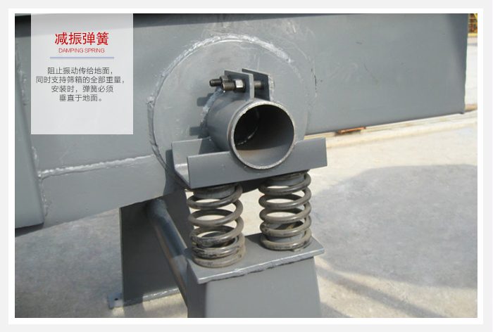 6、減振彈簧:阻止振動傳給地面,同時支持篩箱的全部重量,安裝時,彈簧必須垂直于地面。