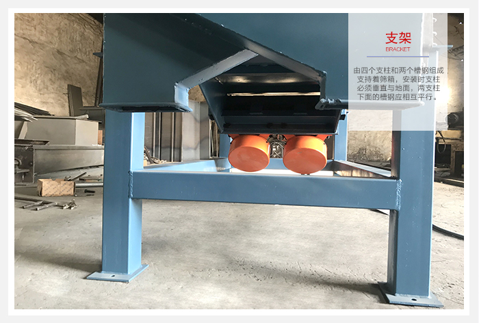 7、支架:由四個支柱和兩個槽鋼組成,支持著篩箱,安裝時支柱必須垂直與地面,兩支柱下面的槽鋼應相互平行。