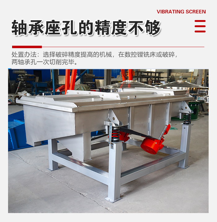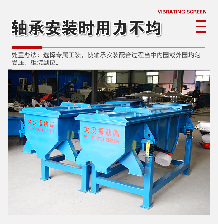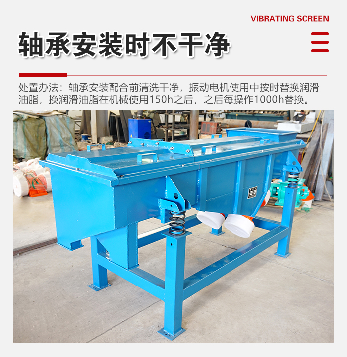 處置辦法:軸承安裝配合前清洗干凈,振動電機使用中按時替換潤滑油脂,換潤滑油脂在機械使用150h之后,之后每操作1000h替換。