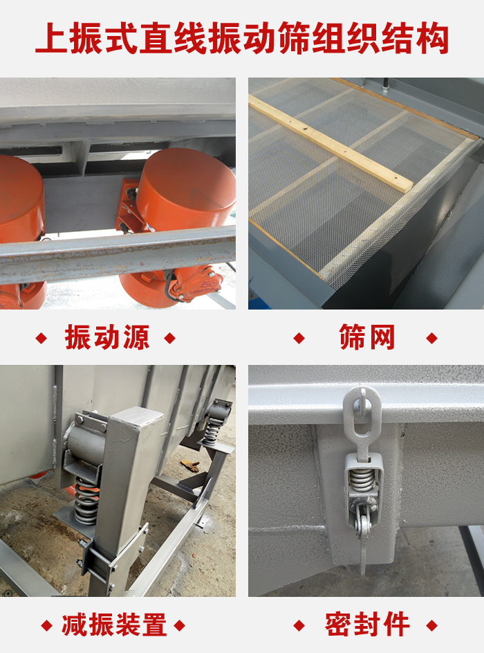 由振動源、篩體、篩網(wǎng)、減振裝置及底架組成,篩箱由篩框、篩板、襯板組成,篩板側板采用優(yōu)質鋼板制作而成,側板和橫梁、激振器底座采用高強度螺栓或環(huán)槽鉚釘連接,結構合理,堅固耐用。