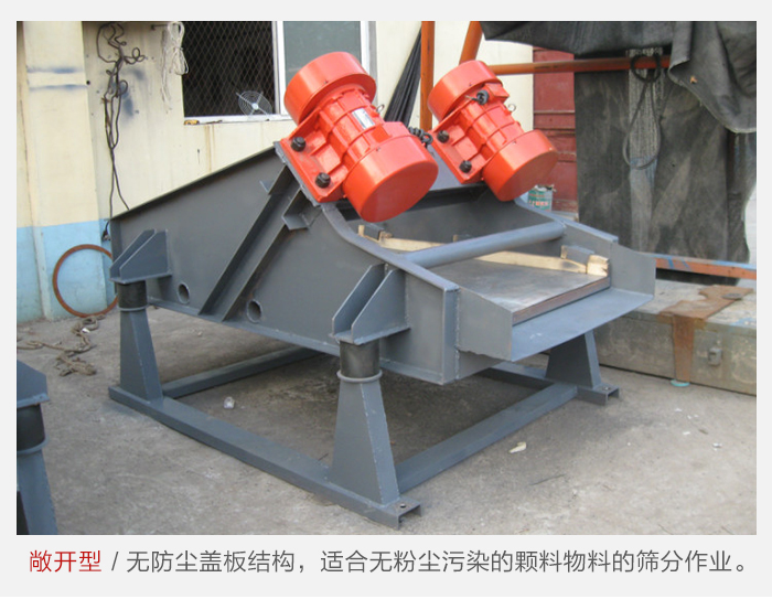 敞開型(ZSG-寬×長)為座式,無防塵蓋板結構,用于大篩分能力,無粉塵污染的顆料物料的篩分作業(yè)。