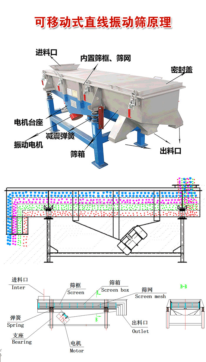可移動式直線振動篩為雙振動電機驅動。當兩臺振動電機做同步、反向旋轉時,其偏心塊所產生的激振力在平行于電機軸線的方向相互抵消,在垂直于電機軸的方向疊為一合力,因此篩機的運動軌跡為一直線。兩電機軸相對篩面在垂直方向有一傾角,在激振力和物料自重力的合力作用下,物料在篩面上被拋起跳躍或向前作直線運動,從而達到對物料進行篩選和分級的目的。