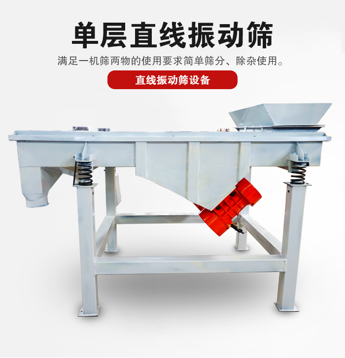 單層直線振動篩是比較常見的一種,擁有一層篩網,兩個出兩口。完全滿足一機篩兩物的使用要求,所以針對一些簡單的篩分,除雜使用比較方便。