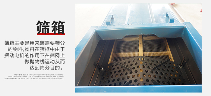 篩箱:篩箱主要是用來裝需要篩分的物料,物料在篩框中由于振動電機的作用下在篩網上做拋物線運動從而達到篩分目的。