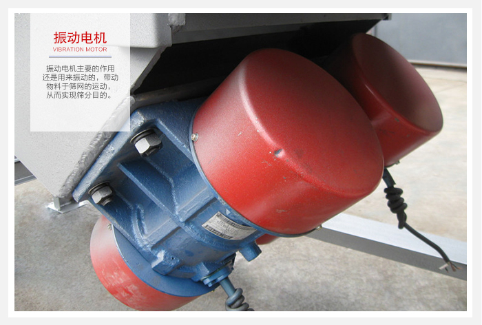 振動(dòng)電機(jī):振動(dòng)電機(jī)的使用是比較廣泛的而直線振動(dòng)篩的振動(dòng)電機(jī)主要的作用還是用來(lái)振動(dòng)的,帶動(dòng)物料于篩網(wǎng)的運(yùn)動(dòng),從而實(shí)現(xiàn)篩分目的。