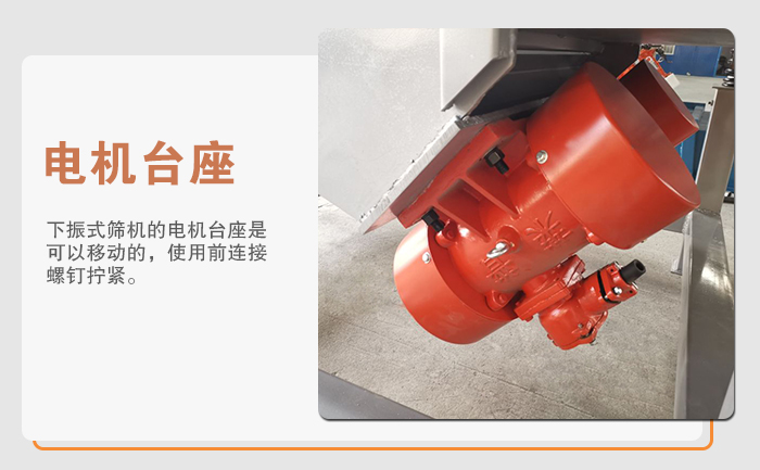 4、電機(jī)臺座:下振式(電機(jī)安裝在篩箱下方的)篩機(jī)的電機(jī)臺座是可以移動的,使用前連接螺釘擰緊,是新篩機(jī)試用前三天反復(fù)緊固,以免松動造成事故。