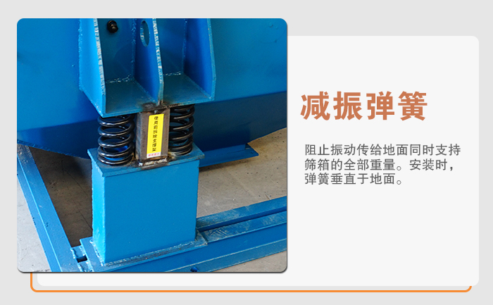 5、減振彈簧:阻止振動傳給地面同時(shí)支持篩箱的全部重量。安裝時(shí),彈簧垂直于地面。