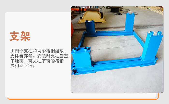 6、支架:由四個(gè)支柱和兩個(gè)槽鋼組成,支撐著篩箱。安裝時(shí)支柱垂直于地面,兩支柱下面的槽鋼應(yīng)相互平行。