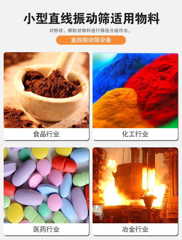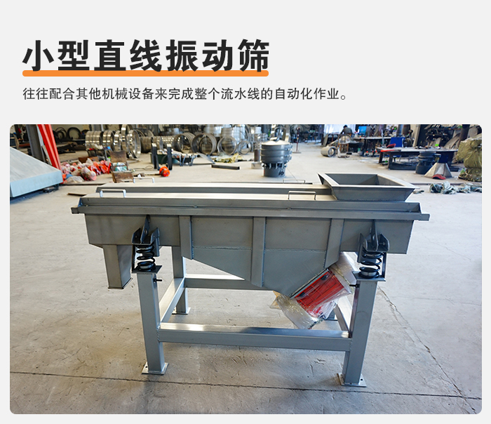 往往配合其他機械設備、如輸送機、提升機、破碎機等,完成整個流水線的自動化作業。直線篩粉機用振動電機作為振動源,使物料在篩網上被拋起,同時向前作直線運動,物料從給料機均勻地進入篩分機的進料口,通過多層篩網產生數種規格的篩上物、篩下物、分別從各自的出口排出。因為物料運行軌跡為直線運動,因此稱為直線篩或直線振動篩。