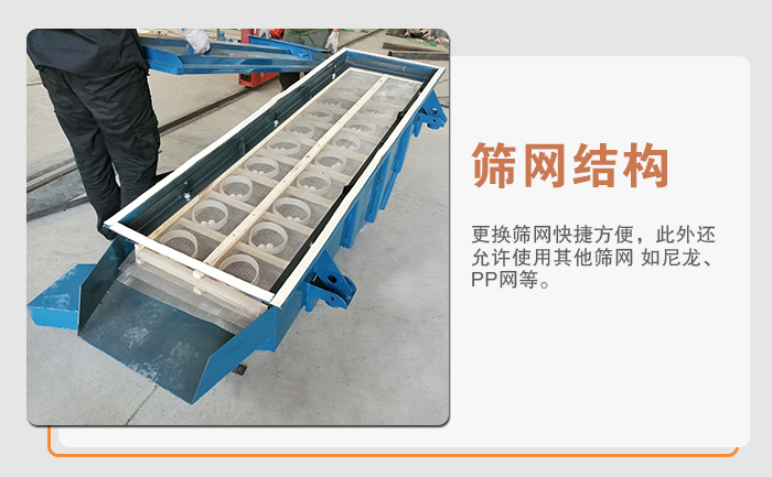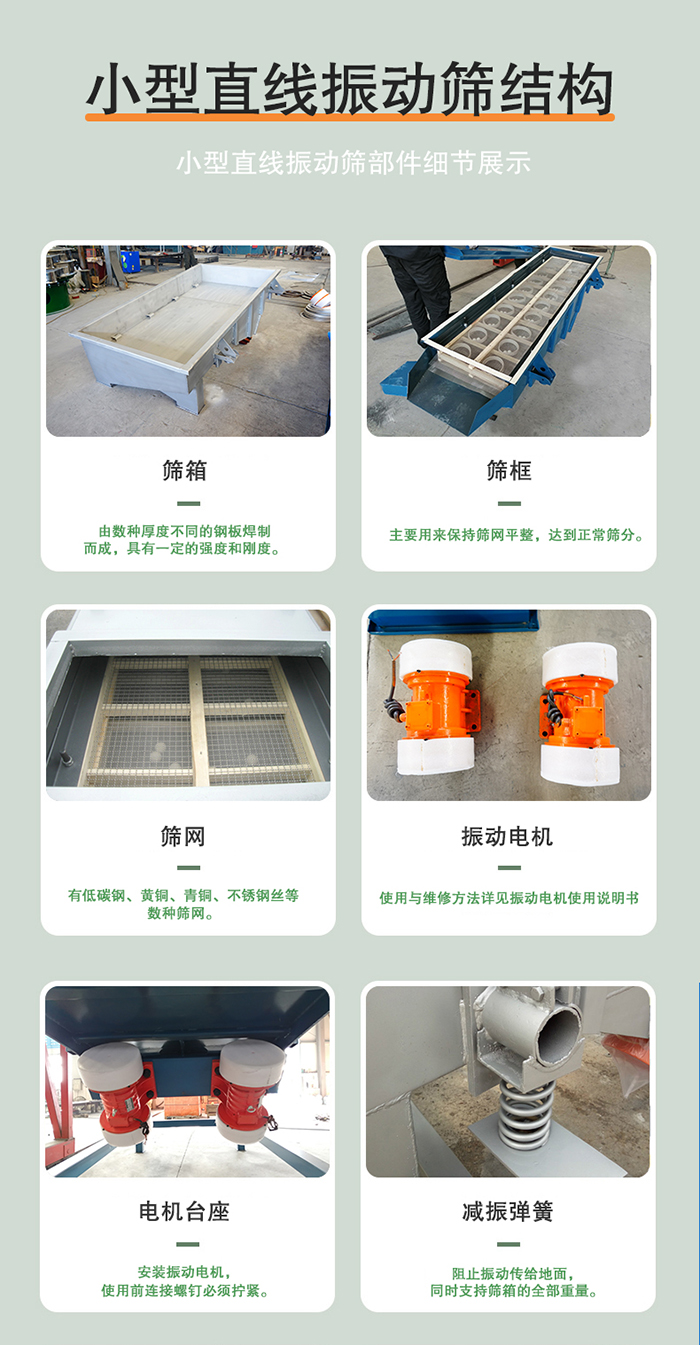 小型直線振動篩主要由篩箱、篩框、篩網、振動電機、電機臺座、減振彈簧、支架等組成。
