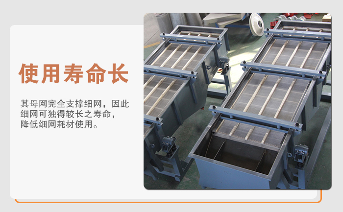 4、其母網完全支撐細網,因此細網可獨得較長之壽命,而降低細網耗材使用,淤長時間 之生產過程可降低諸多成本。
