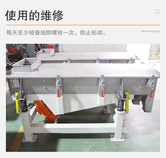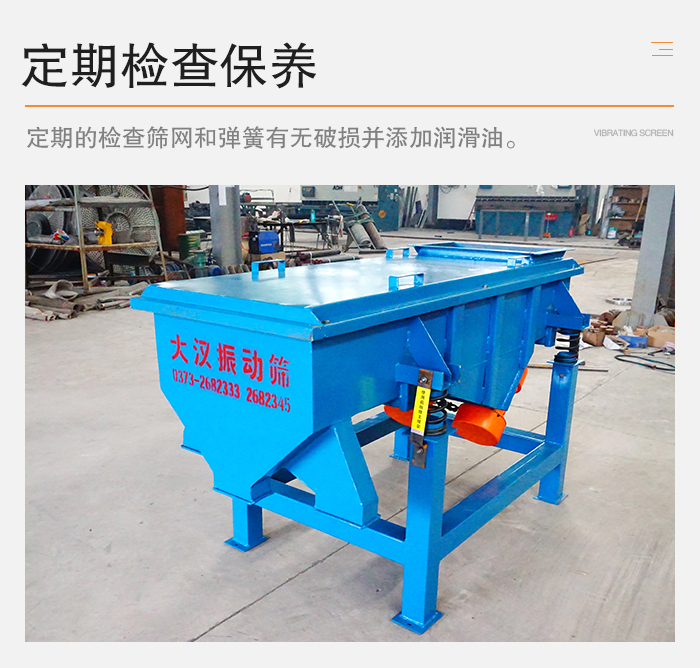 定期的檢查粗網,細網和彈簧有無疲勞及破損,機身各部位是否因振動而產生損壞,需添加潤滑油的部位必須加油潤滑。