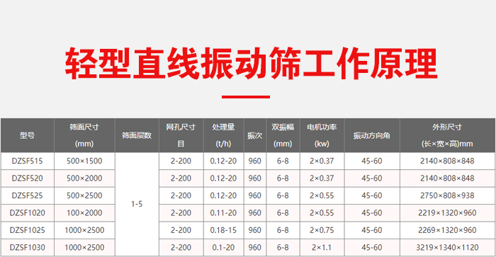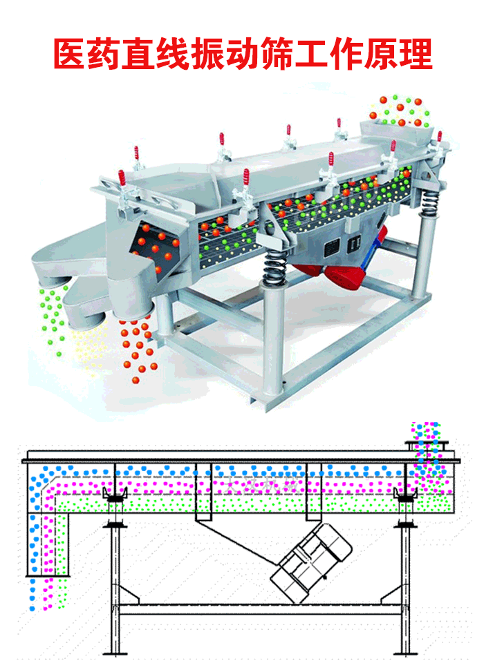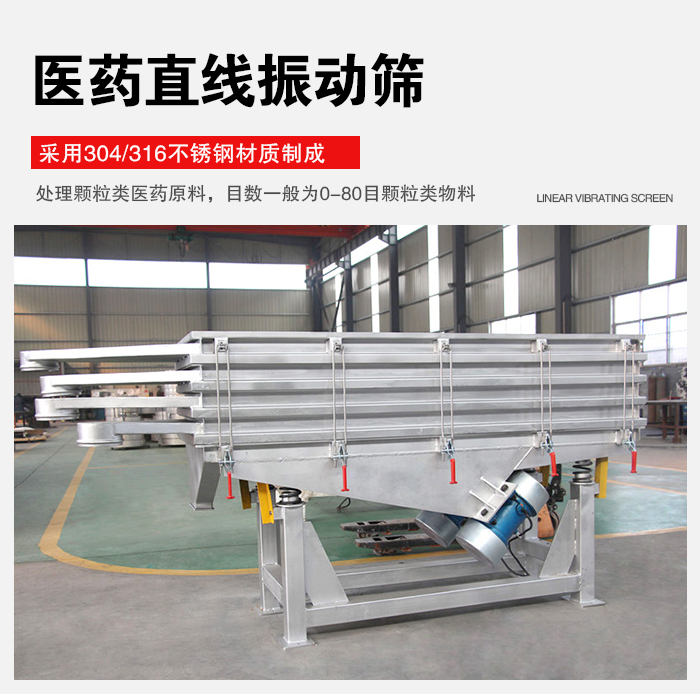 一般處理顆粒類醫(yī)藥原料,目數(shù)一般為0-80目顆粒類物料,主要在于該設(shè)備的動(dòng)力源是兩臺(tái)同激振力大小的反向臥式振動(dòng)電機(jī)同時(shí)作用,因此在縱向的激振力相互抵消,而水平方向的激振力相互疊加,再加上物料自身的重力作用,在其合力方向也就是直線篩篩面水平方向,物料做直線跳躍式前進(jìn)運(yùn)動(dòng)。