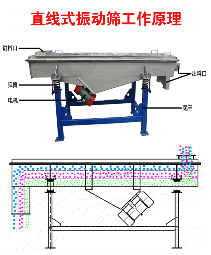 直線式振動篩的結構包括:篩網,篩箱,防塵蓋,進料口,振動電機以及出料口等。