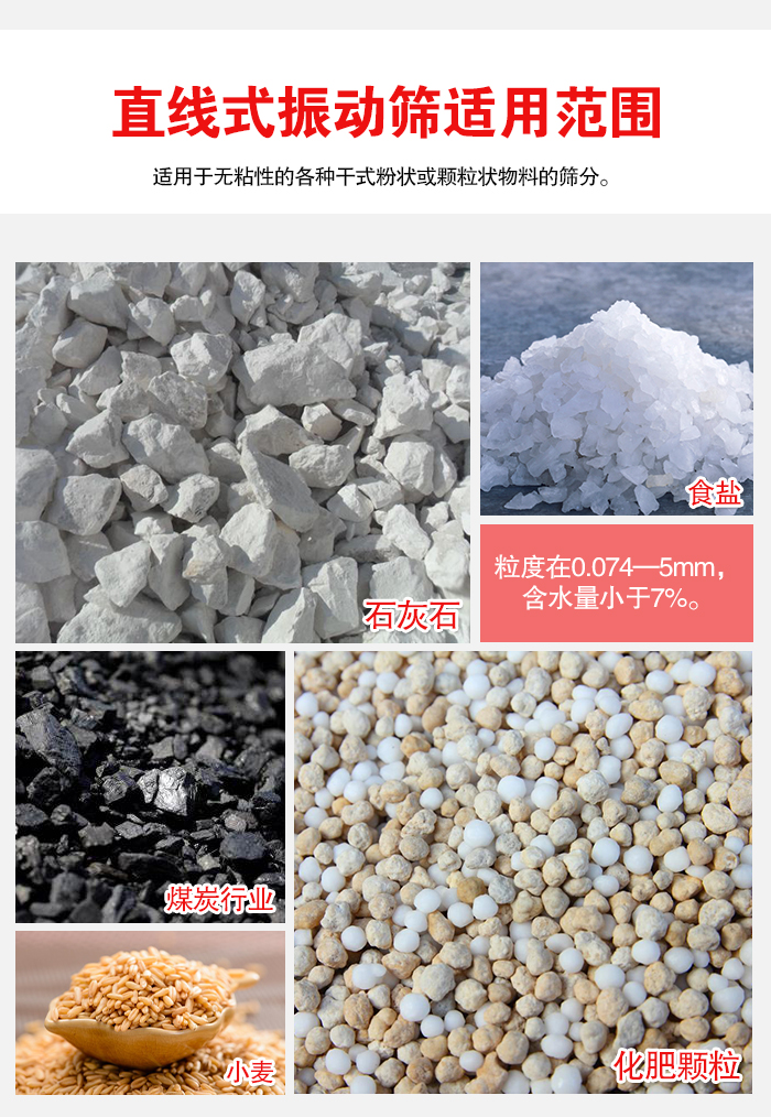 直線式振動篩設備適用物料的粒度在0.074-5mm之間,物料的含水量不能大于7%,而且要是干的物料才能夠進行篩分。