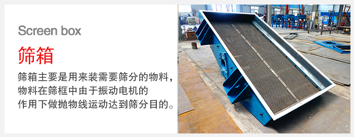 篩箱:篩箱主要是用來裝需要篩分的物料,物料在篩框中由于振動電機的作用下在篩網上做拋物線運動從而達到篩分目的。