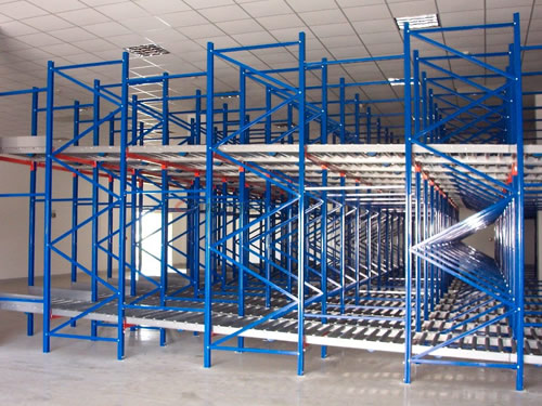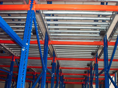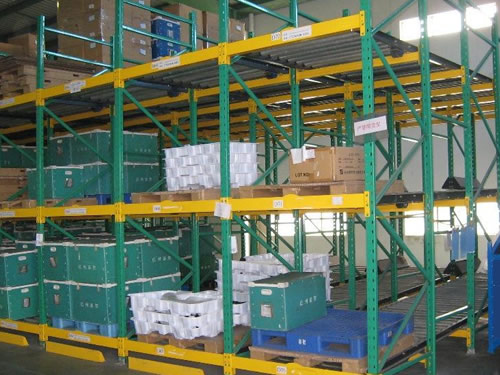 重力式貨架又叫輥道式貨架,屬于倉儲貨架中的托盤類存儲貨架。重力式貨架是橫梁式貨架衍生品之一,貨架結構與橫梁式貨架相似,只是在橫梁上安上滾筒式軌道,軌道呈3-5°傾斜。托盤貨物用叉車搬運至貨架進貨口,利用自重,托盤從進口自動滑行至另一端的取貨口。重力式貨架屬于先進先出的存儲方式。