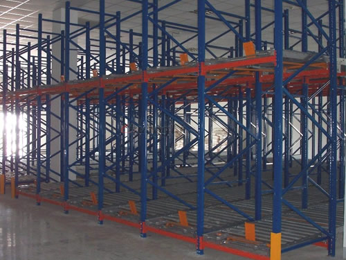 重力式貨架由托盤式貨架演變而成,采用滾筒式軌道或底輪式托盤。